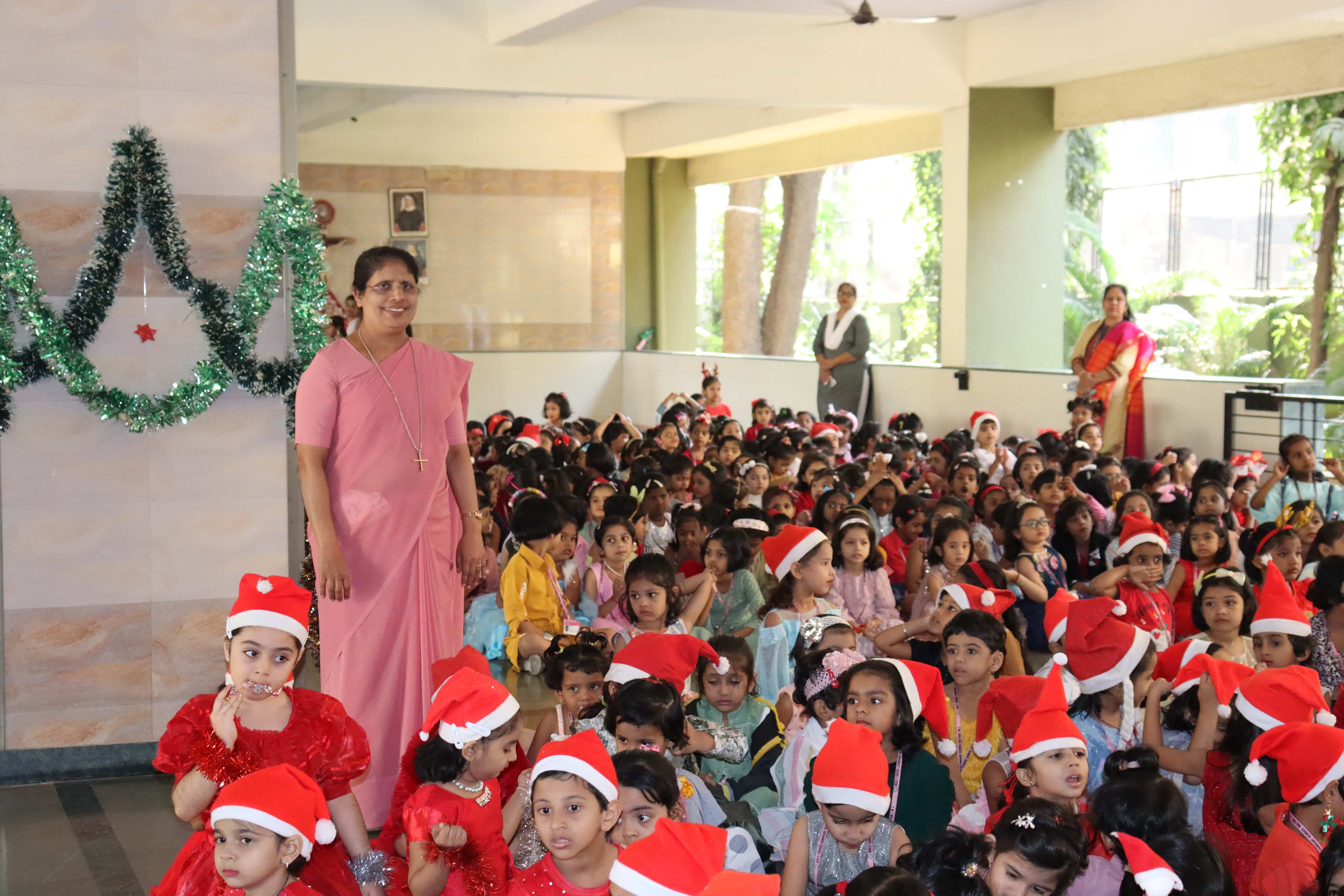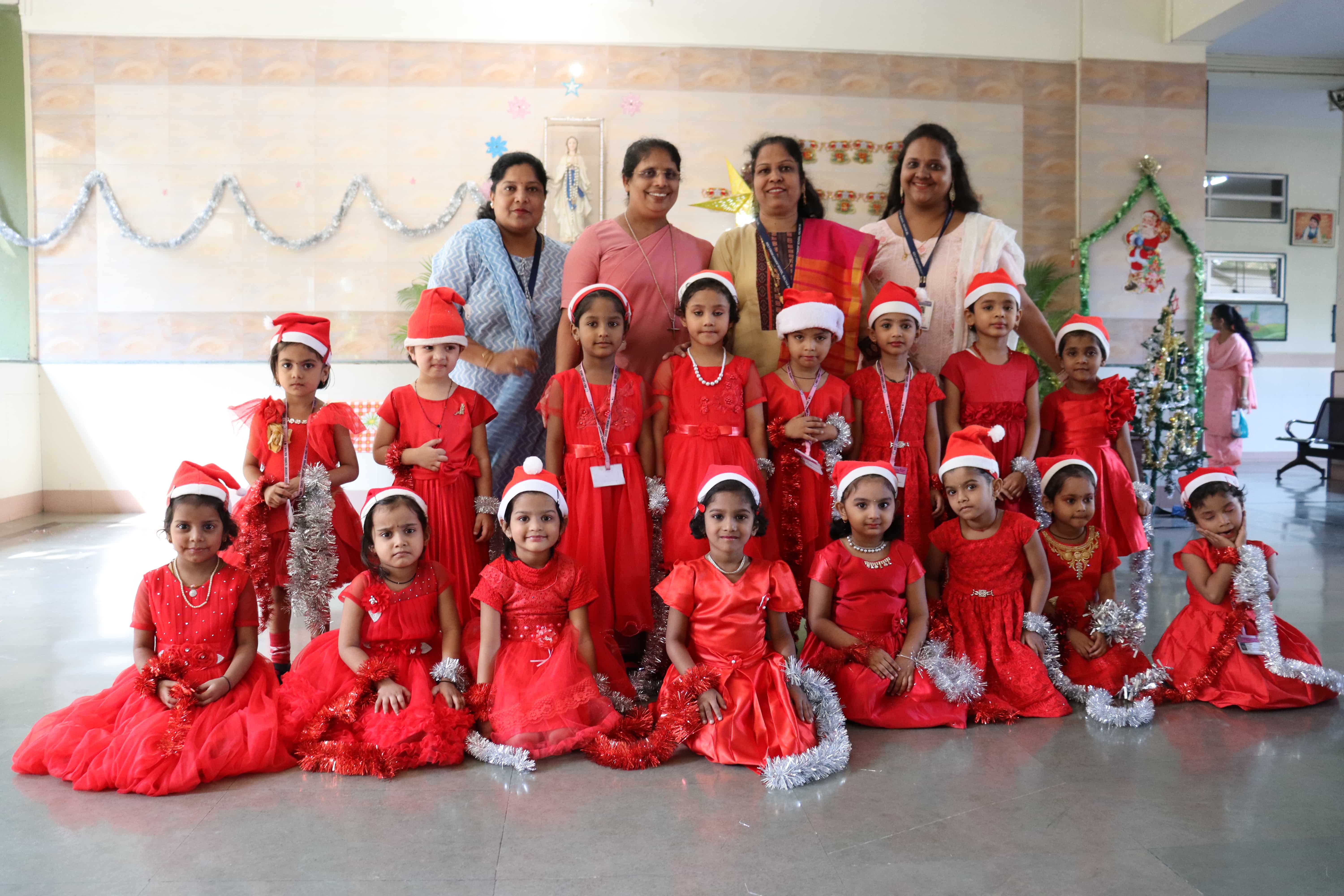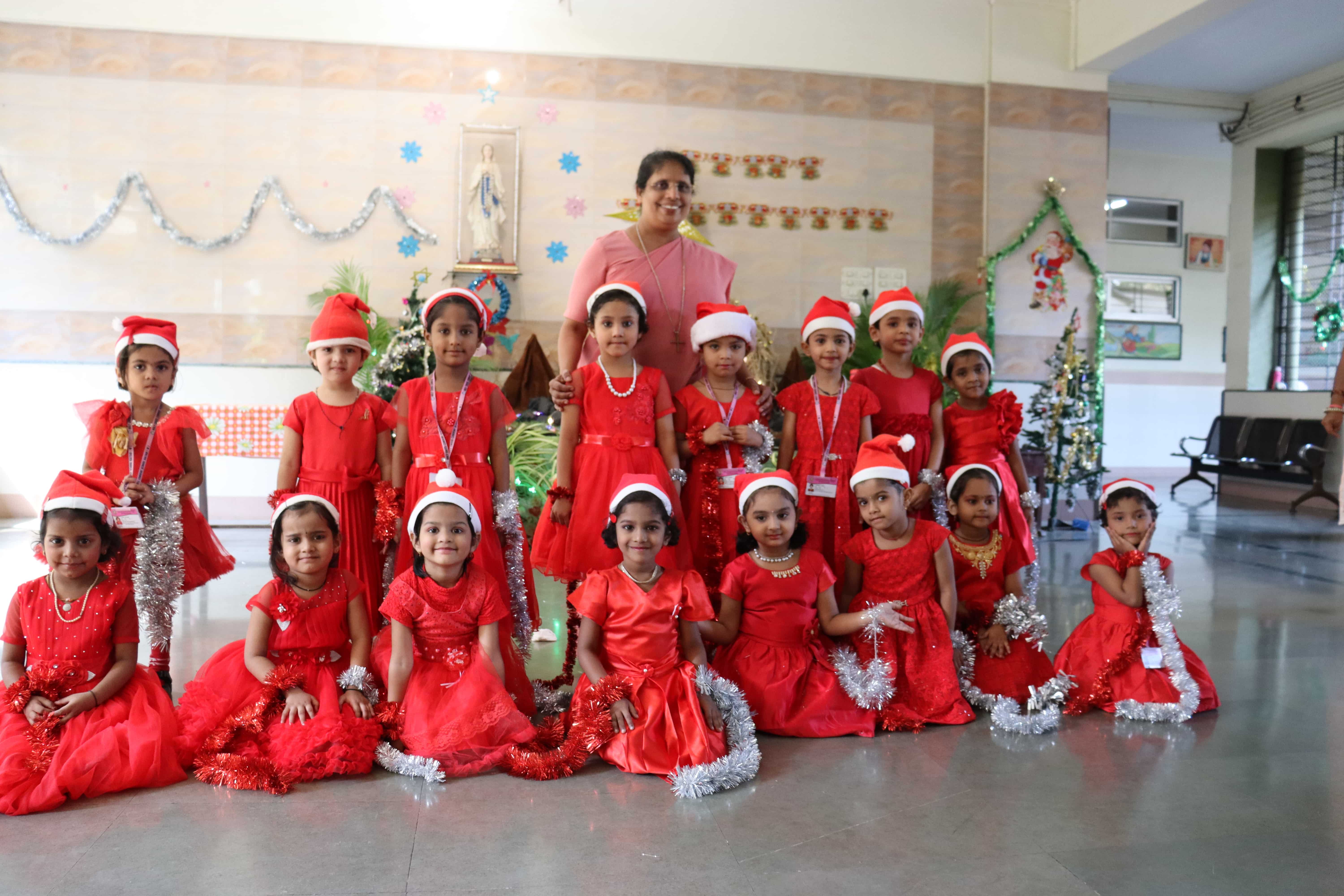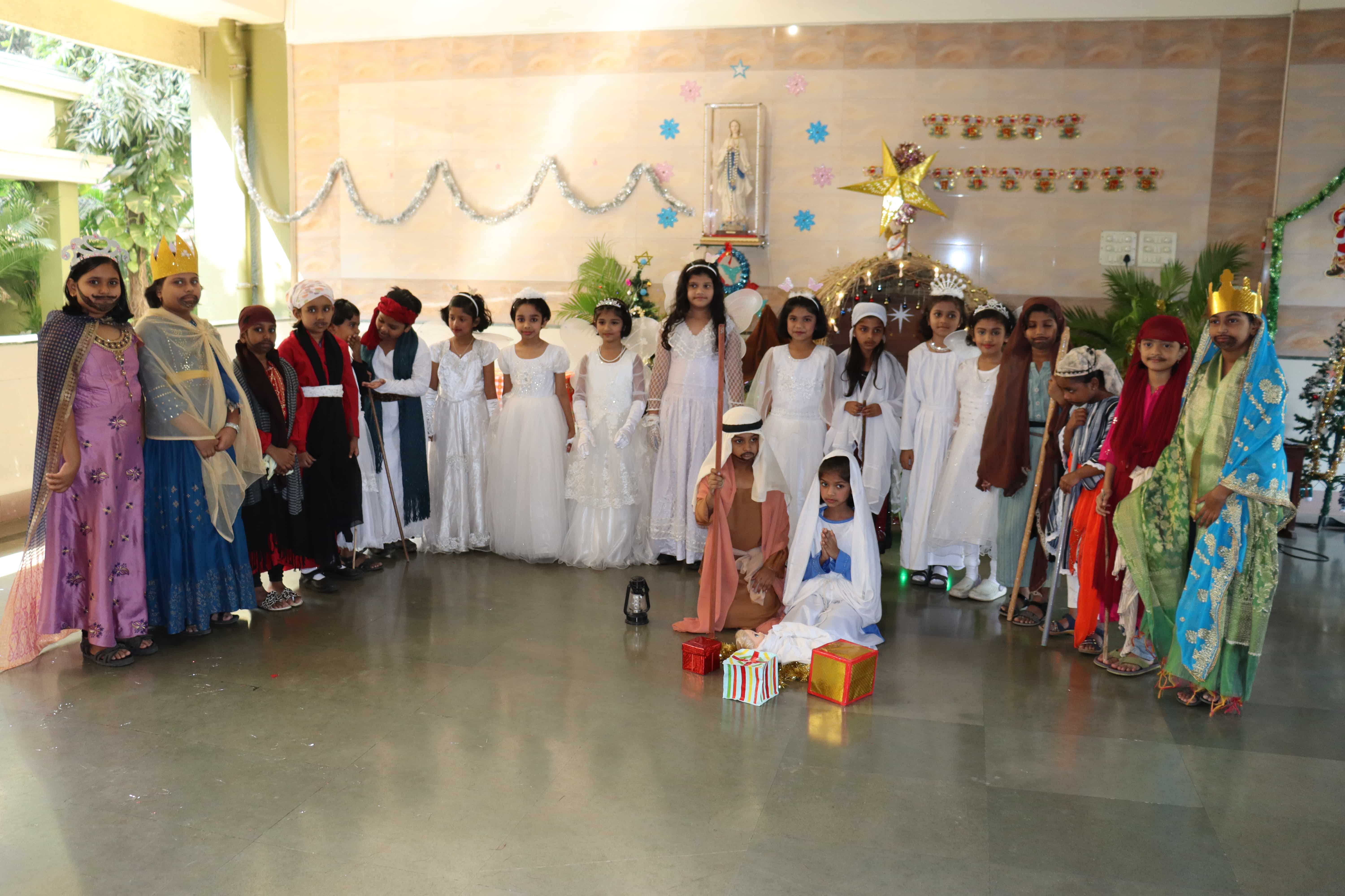 The delightful celebration included children coming in colourful dresses, bringing their favourite food in the tiffin’s, dancing and sharing the merriment together. The students were told about the birth of Lord Jesus through a tableau on Nativity. To encapsulate and express the joy, devotion and to explain what happened around Jesus Christ’s birth, Christmas Carols were sung by our students. The essence of Christmas came alive with the arrival of Santa Claus. Our beloved Headmistress Rev. Sr. Anees George gave us a beautiful message stating that Christmas indeed was a celebration of peace, love, togetherness and to be grateful, spread happiness and enjoy it to the fullest. The boundless joy of celebrating the festival was visible on the faces of the children especially when Santa Claus moved around dancing with them. May the sparkle and joy of Christmas infuse the life of each and every one with hope, positivity and joy.