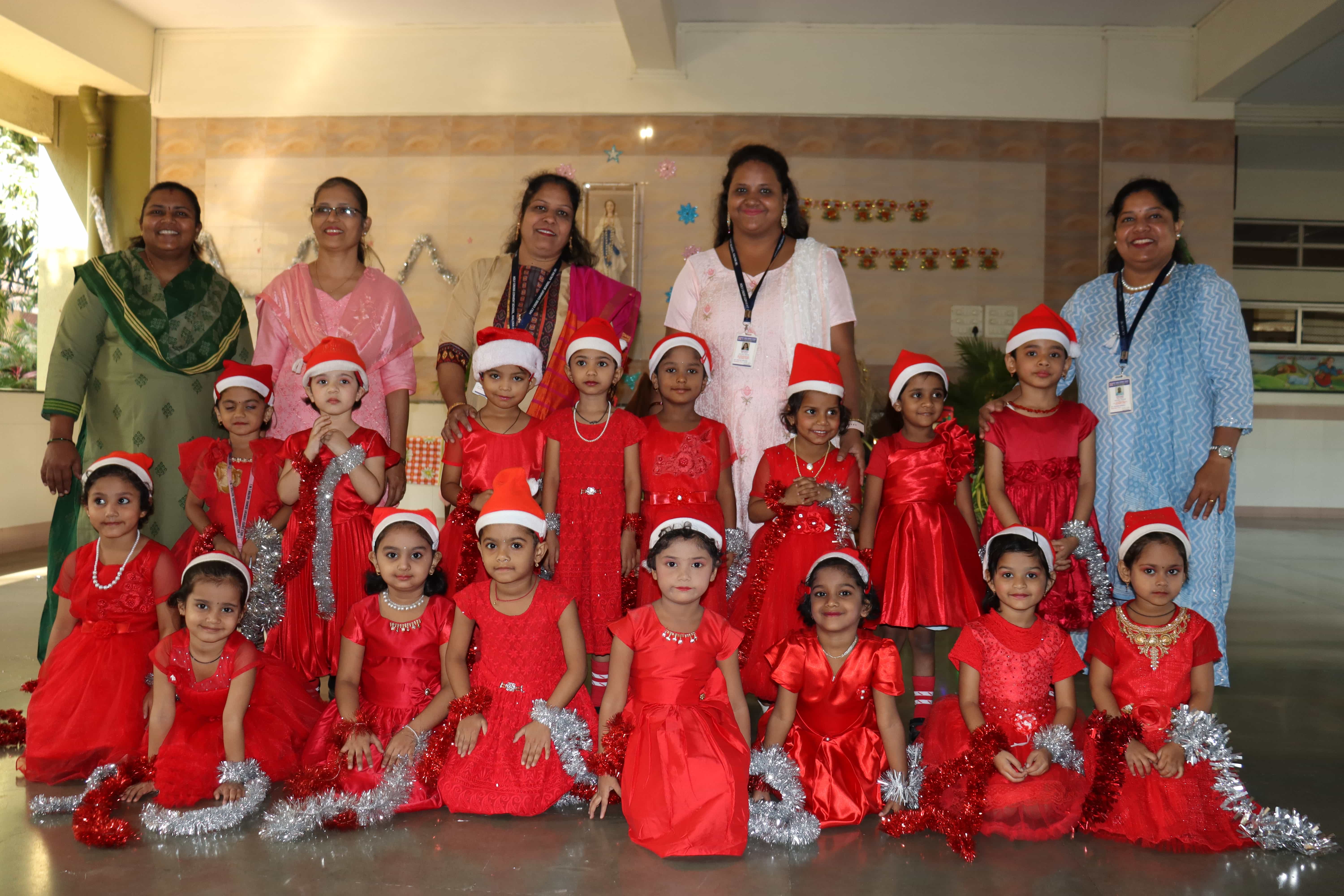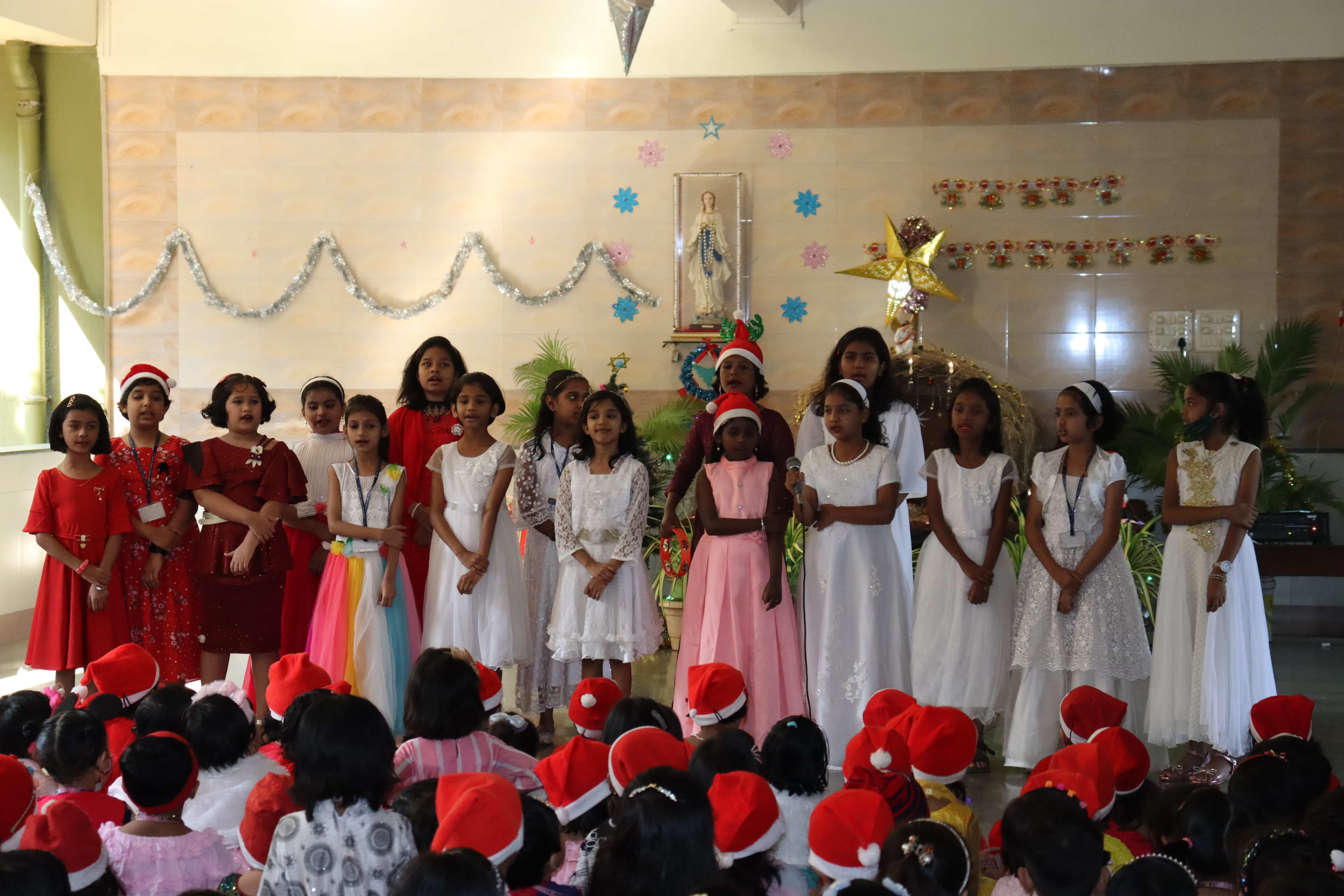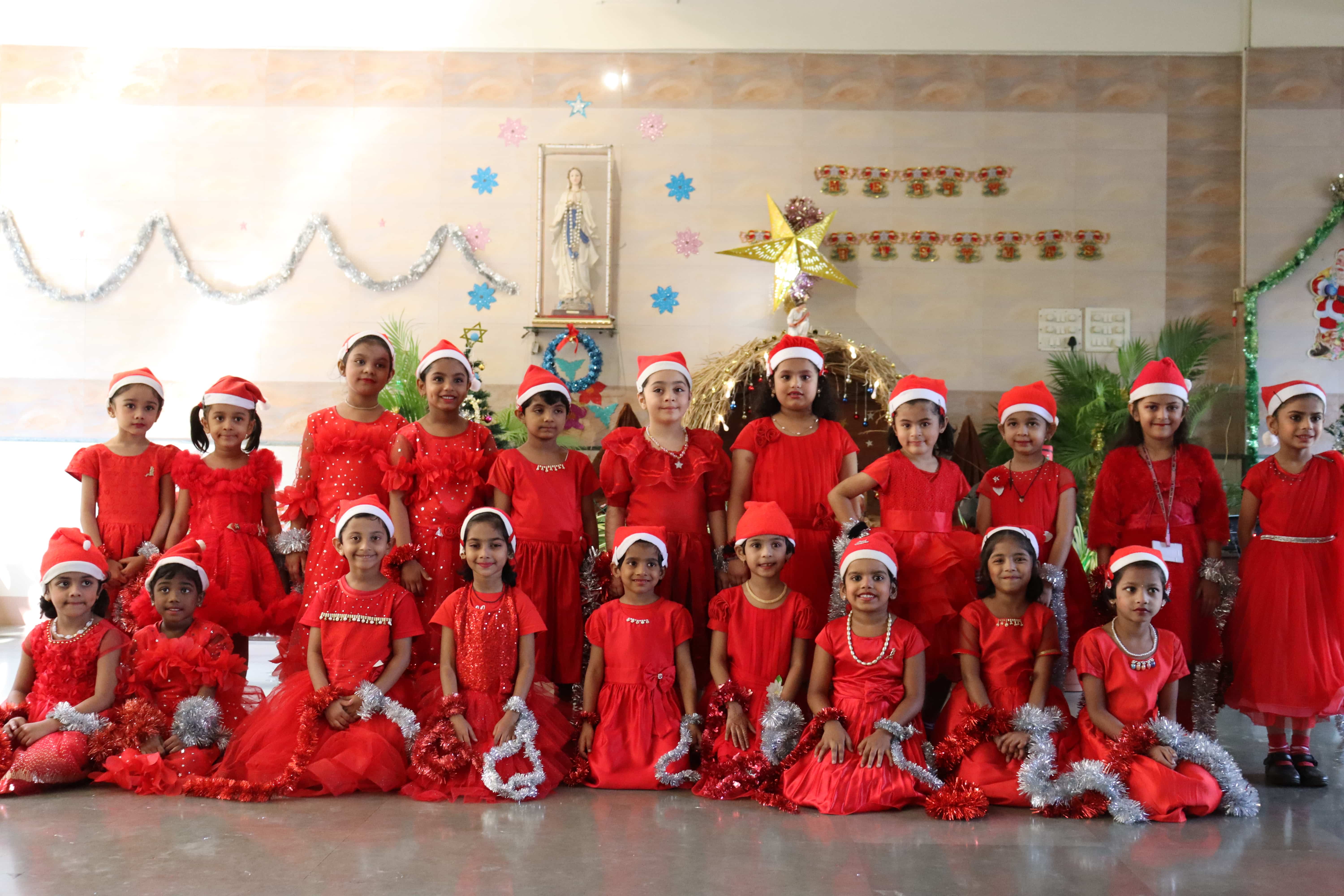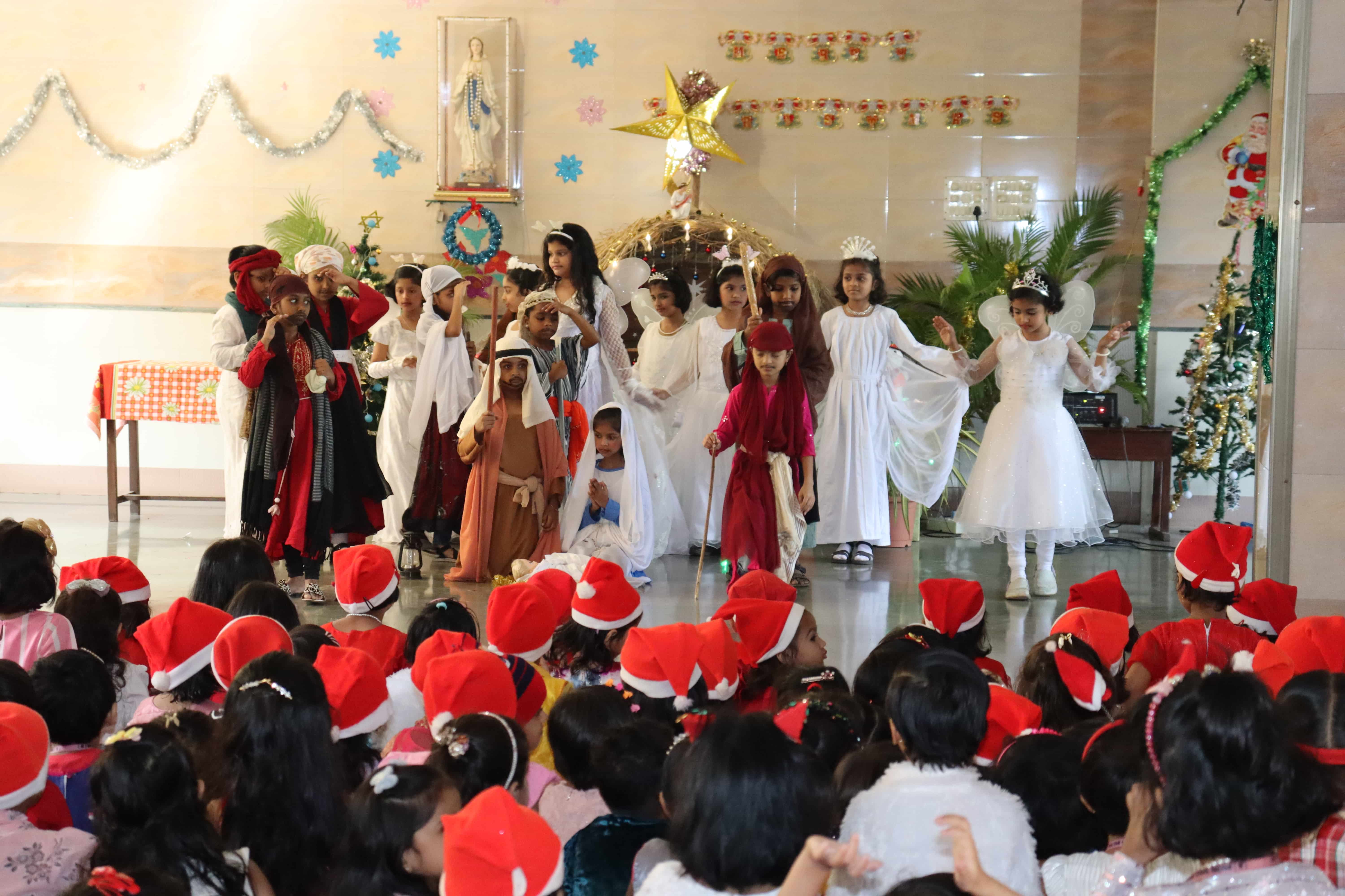 The delightful celebration included children coming in colourful dresses, bringing their favourite food in the tiffin’s, dancing and sharing the merriment together. The students were told about the birth of Lord Jesus through a tableau on Nativity. To encapsulate and express the joy, devotion and to explain what happened around Jesus Christ’s birth, Christmas Carols were sung by our students. The essence of Christmas came alive with the arrival of Santa Claus. Our beloved Headmistress Rev. Sr. Anees George gave us a beautiful message stating that Christmas indeed was a celebration of peace, love, togetherness and to be grateful, spread happiness and enjoy it to the fullest. The boundless joy of celebrating the festival was visible on the faces of the children especially when Santa Claus moved around dancing with them. May the sparkle and joy of Christmas infuse the life of each and every one with hope, positivity and joy.